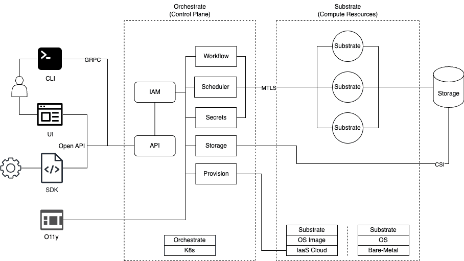 Historically, the infrastructure management layer of Fuzzball has two main components. Substrate delivers a custom container runtime and per-node resource manager, and Orchestrate manages and schedules complex, multi-step workloads as well as the data necessary to run these workflows.