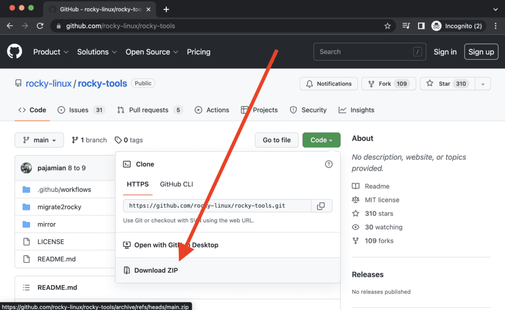 Option 1: Download the compressed archive from GitHub and extract the correct script (migrate2rocky.sh or migrate2rocky9.sh) for your scenario. You’ll find the zip files for any GitHub repo on the right side of the repo’s main page.