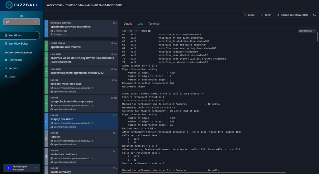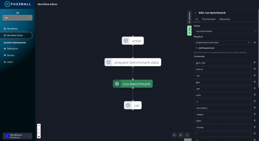 Fuzzball gives users a robust and modern web-based GUI to manage creating and running their workflows. The API-driven nature of Fuzzball’s user-facing components allows users to interact with a cluster and their work on it from afar, without having to use the Linux command line or connect to the server via SSH.