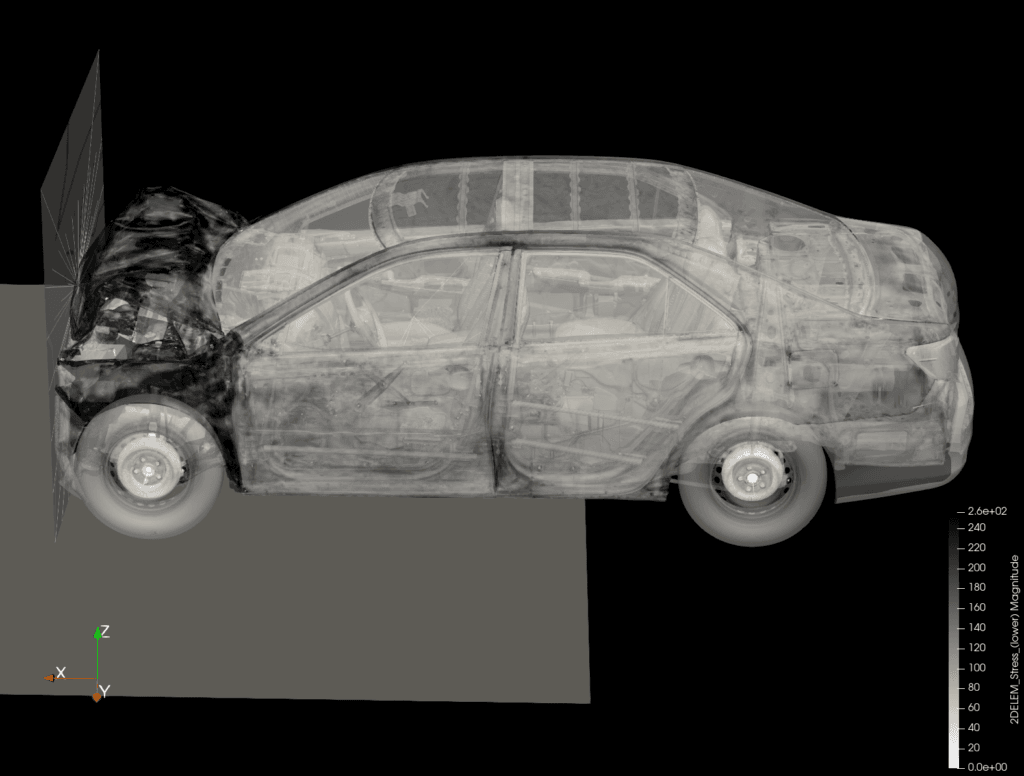 To visualize our results, simply call ParaView providing it which file to render. Here is the command and resulting visualization for CamryOpenRadiossA010.vtk