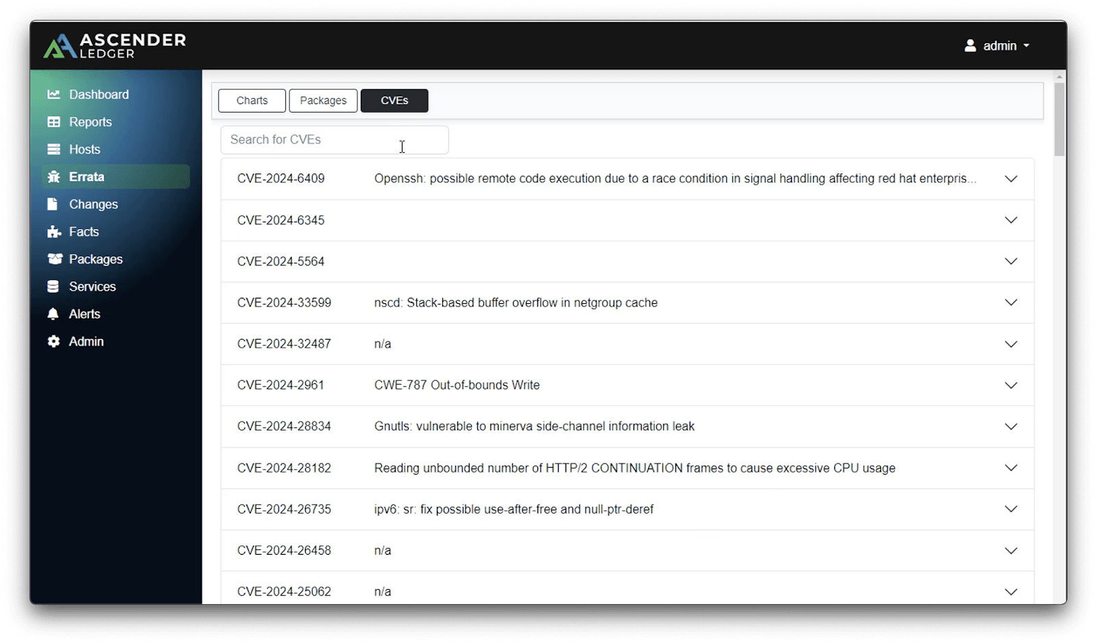 Vulnerability and patch management: Ascender Pro tracks errata and CVEs (Common Vulnerabilities and Exposures) across your infrastructure, showing which packages or services on each host may be vulnerable. It provides detailed CVE descriptions and links to official notices, helping admins prioritize and patch vulnerabilities before they become bigger issues.